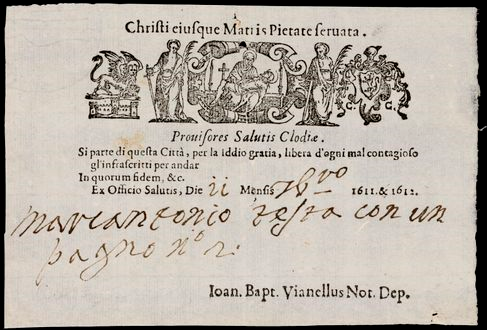 Năm 1611 khi Marcantonio Zezza rời Venice, một mảnh giấy trong túi có thể là một trong những tài sản quý giá nhất của ông. Tờ giấy viết tay đề tên và các dữ liệu quan trọng về ông và có chữ ký của một quan chức, chứng nhận rằng ông đã rời thành phố “với ân điển của Chúa” “và không có ‘tệ nạn’ lây nhiễm”.