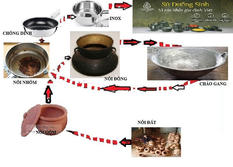 Người nguyên thủy bắt từ đất nặn ra nồi đất nung, (nay vẫn còn ở nhiều nơi ở nước ta) tiến lên nồi gốm (như đang dùng ở các quán cơm niêu), sang nồi đồng, vươn lên nồi gang (sắt), nhôm, rồi đến nồi kim loại phủ chống dính (bằng teflon, tráng men hoặc sứ) hiện đại nhất là inox và chưa hết đâu, mới xuất hiện một hai năm gần đây là nồi sứ toàn phần (gọi tắt là nồi sứ-porcelain), tức là lại quay về vật liệu đất với một trình độ cao hơn gấp bội. Tại sao lại quay về với đất, khi mà đã đạt đến sự hiên đại, thuận tiện, sạch sẽ như chất liệu chống dính, Inox ?