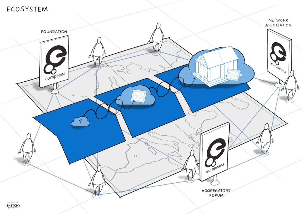 Hệ sinh thái của Europeana gồm cơ quan chủ quản là Europeana .Foundation (Quỹ Europeana), Liên minh đối tác (bao gồm các chuyên gia về bảo tồn văn hóa), Diễn đàn cho những nhà thu thập dữ liệu – là nơi thu thập các dữ liệu văn hóa, làm việc trực tiếp với các bảo tàng, cơ sở giáo dục, thư viện, kho lưu trữ riêng lẻ.