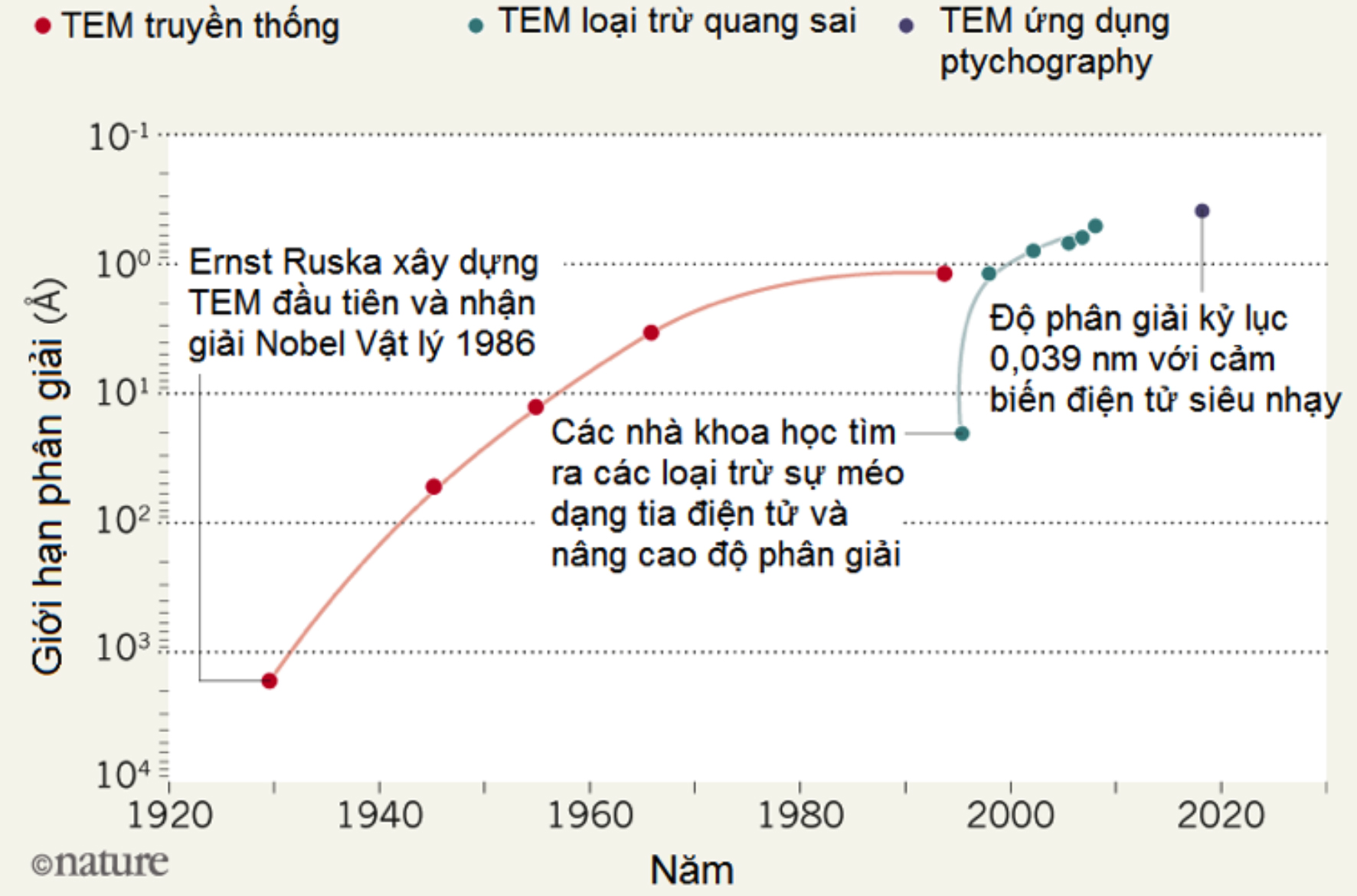 Hình 1. Độ phân giải của kính hiển vi điện tử TEM đã được nâng cấp hàng ngàn lần kể từ khi lần đầu tiên xuất hiện hơn 80 năm trước. Hình được sửa đổi từ hình nguyên bản trên Nature4