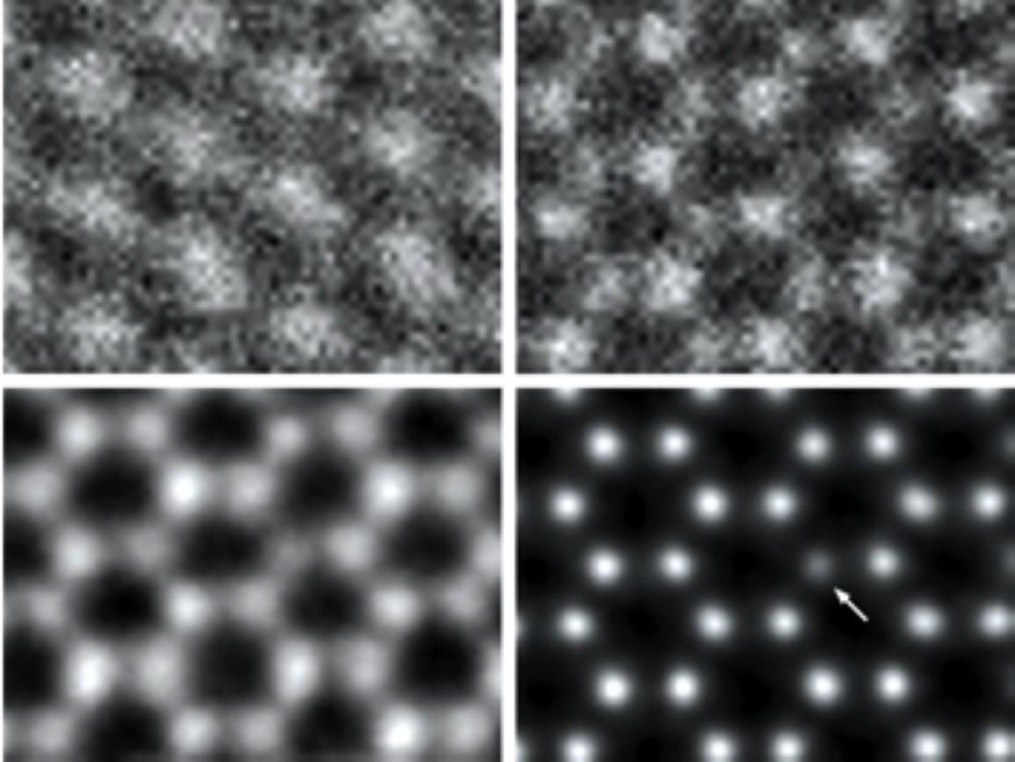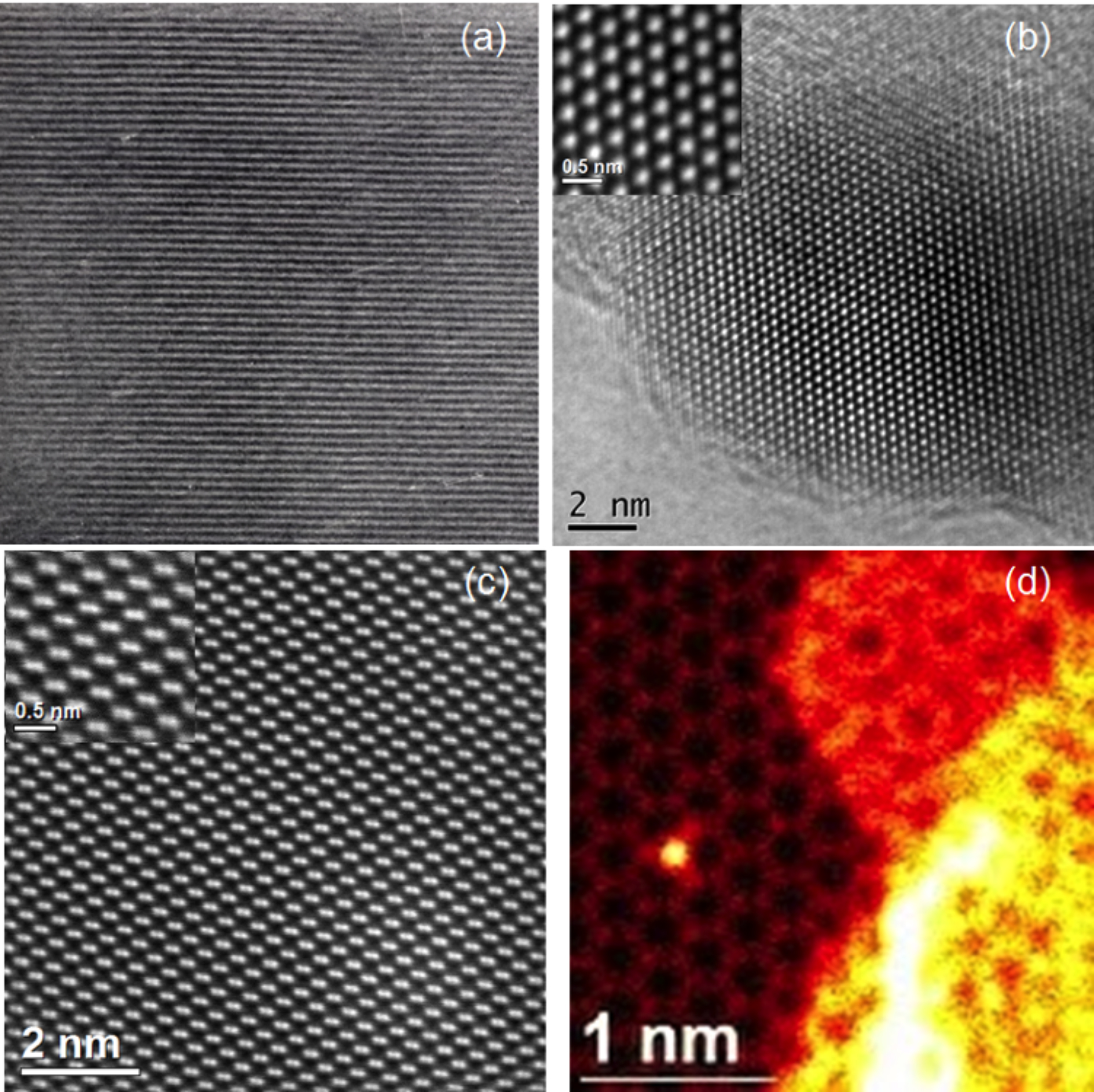 Hình 2. Từ những hình ảnh phân giải cao đầu tiên của mạng tinh thể platinum phthalocyanine (a) ghi nhận lần đầu tiên năm 1959,6 cho tới các nguyên tử Ag trong mạng tinh thể của một hạt nano (b), các nguyên tử Si trong mạng tinh thể (c) và đơn nguyên tử Si (màu vàng) trong mạng tinh thể graphene (d) 10. Các bức ảnh (b,c) được chụp bởi tác giả bằng kỹ thuật HRTEM và HR-STEM tại Manchester có độ phân giải lần lượt 1,1 Å và 0,7 Å.