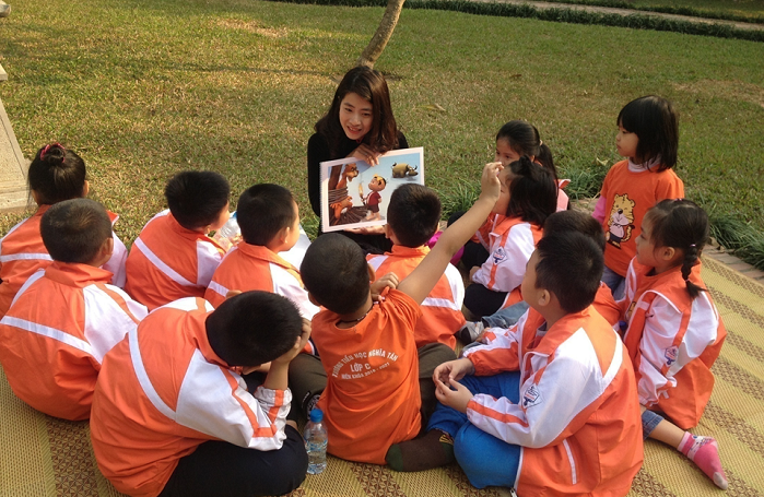 Học sinh lớp một cùng thảo luận về hình ảnh con hổ tại Văn Miếu.