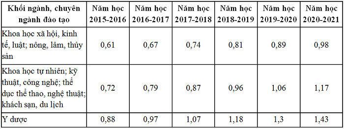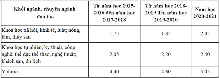 Bảng 1. Mức trần học phí với các chương trình đào tạo đại trà trình độ đại học tại các cơ sở giáo dục công lập chưa tự bảo đảm kinh phí chi thường xuyên và chi đầu tư áp dụng theo các khối ngành, chuyên ngành đào tạo từ năm học 2015-2016 đến năm học 2020-2021 (Đơn vị: Triệu đồng/tháng/sinh viên).