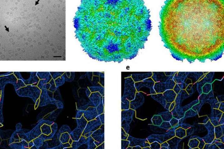 Từ trái qua, từ trên xuống: VLP dạng tinh thể; Sự tái cấu trúc virus gây bệnh bại liệt (PV3); Lát cắt VLP rỗng bên trong (không chứa nucleic); Hình ảnh túi protein VP1 trên virus gây bệnh bại liệt; Hình ảnh PV3. Nguồn: John Innes Centre