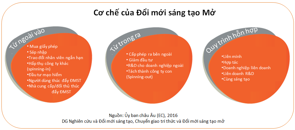 Hình 1 cho thấy EU/EC coi ĐMST ‘có thể không còn được xem như kết quả của các hoạt động ĐMST xác định trước và biệt lập, mà thay vào đó như là kết quả đầu ra của một quy trình đồng sáng tạo phức tạp có liên quan tới các dòng chảy tri thức xuyên khắp toàn bộ môi trường kinh tế và xã hội. Việc cùng sáng tạo này diễn ra ở các phần khác nhau của hệ sinh thái ĐMST và đòi hỏi trao đổi tri thức cũng như năng lực hấp thụ từ tất cả các tác nhân tham gia, bất kể là doanh nghiệp, viện nghiên cứu, cơ sở tài chính, chức trách nhà nước hay công dân’. Từ nhận thức này, EU/EC đã đưa ra các cơ chế của Đổi mới sáng tạo Mở như Hình 2 bên dưới.