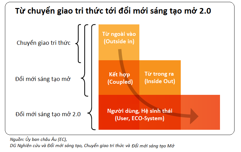 Xây dựng hệ sinh thái cho Đổi mới sáng tạo Mở: EU/EC xây dựng chính sách dựa vào 3 trụ cột hành động gồm: (1) Cải cách môi trường pháp lý; (2) Thúc đẩy đầu tư của tư nhân vào nghiên cứu và Đổi mới sáng tạo; và (3) Tối đa hóa các tác động;
