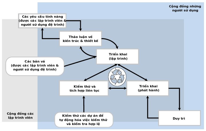 Hình 5 cho thấy cả cộng đồng các lập trình viên (gồm cả các lập trình viên bên ngoài một công ty) và cộng đồng những người sử dụng đều tham gia vào các bước phát triển phần mềm của một dự án phần mềm nguồn mở.