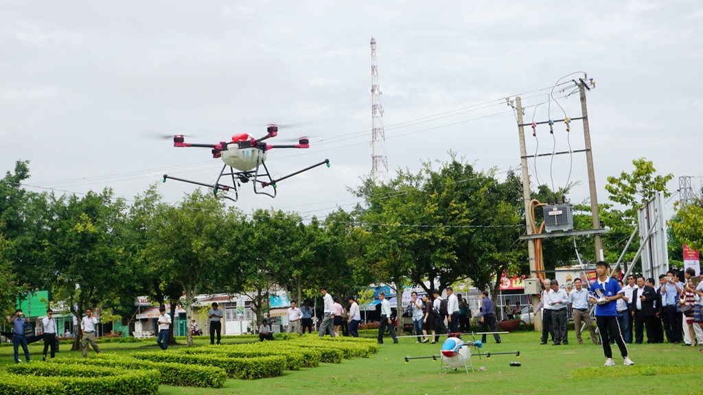 Thiết bị bay không người lái được sử dụng tại Nhật từ 1980 đến nay, ông Phạm Ngọc Phúc, phụ trách kỹ thuật công ty DMM Technologies (Nhật Bản), cho rằng drone nhỏ gọn, chỉ nặng 5 – 7kg, mang theo 5 – 10kg dung dịch thuốc bảo vệ thực vật (BVTV), thời gian phun 10 – 20 phút cho 1ha, tốc độ bay 20km/h, phù hợp với địa hình Việt Nam. Tháng 4/2017, tại hợp tác xã Mỹ Đông 2, drone biểu diễn mang 5 lít thuốc BVTV bay ở độ cao 2 – 3m, cự ly bay 250m, phun 10 lít thuốc BVTV trong 10 phút/ha. Giá thực nghiệm 300.000 đồng/ha, khi triển khai thực tế giá khoảng 450.000 đồng/ha, chưa tính thuốc BVTV.