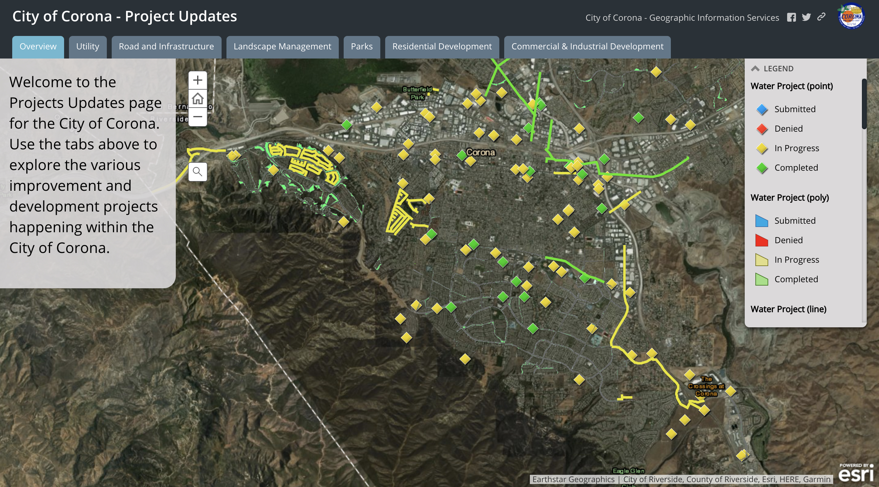 Một cú chụp màn hình GIS của thành phố Corona, California cho thấy sự tăng trưởng và phát triển của các dự án đang diễn ra ở khắp thành phố.