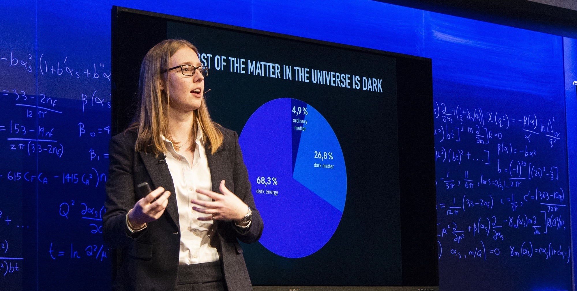 Phiala Shanahan trình bày một bài giảng về vật chất trong vũ trụ. Nguồn: MIT