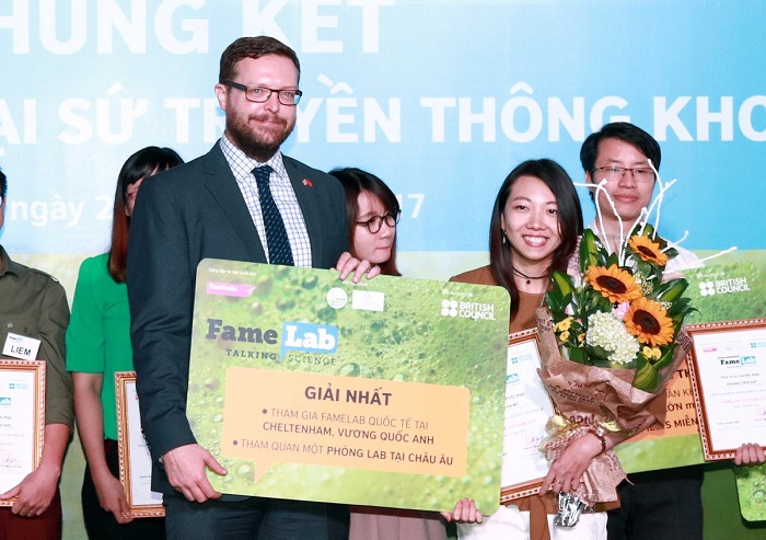 Phạm Hà My (Đơn vị Nghiên cứu Lâm sàng Đại học Oxford tại Việt Nam) là Quán quân FameLab Việt Nam 2017. Ảnh: euraxess
