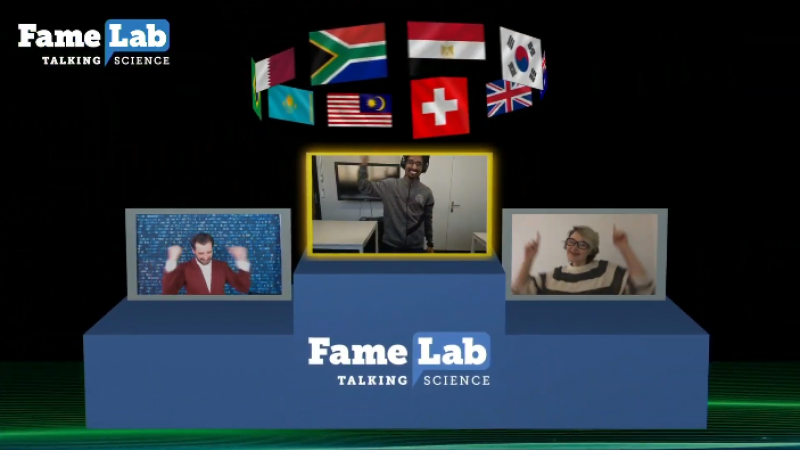 Nhà nghiên cứu đến từ Thụy Sĩ Sauradeep Majumdar đã trở thành quán quân cuộc thi FameLab Quốc tế 2020. Ahmad Maani từ Qatar và Rebecca Ellis từ Vương quốc Anh là Á quân, và Gabriela Ramos Leal từ Brazil đoạt giải thí sinh được khán giả yêu thích nhất. Ảnh: Still Moving Media