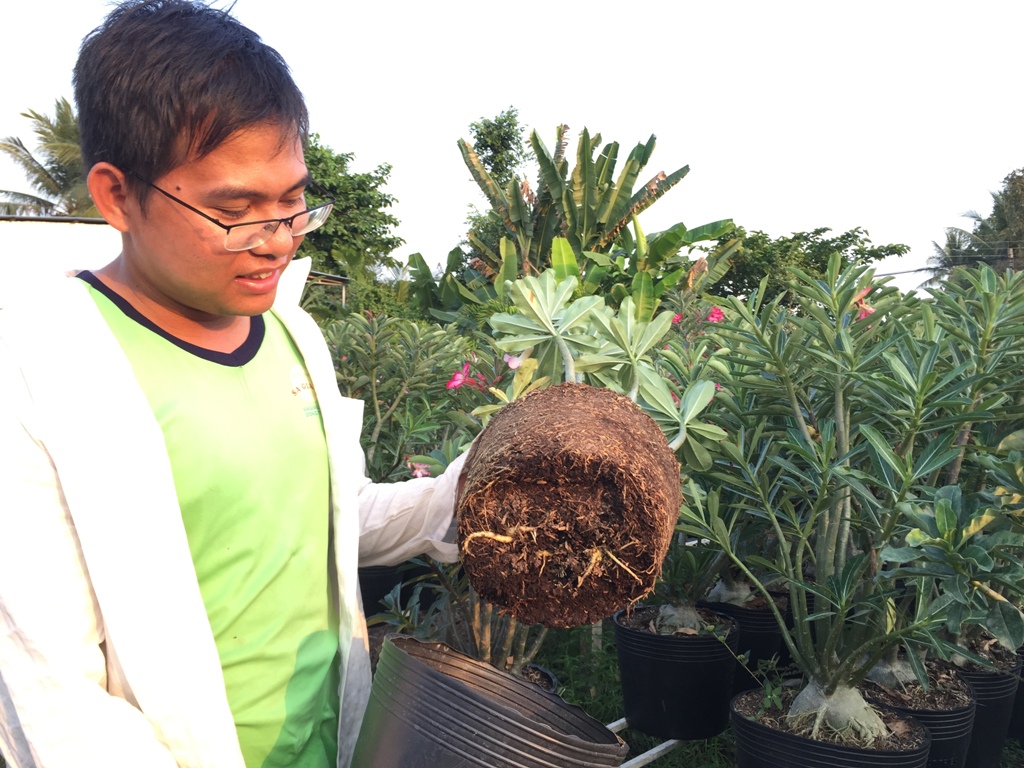 – Ba là người hiền lành, vườn nhà em ba chỉ trồng sứ kiểng.Lúc đầu nhà chỉ có một công, nhà khó khăn lắm nên em mới lên thành phố.Nhưng khi ba gọi về, em đã nghĩ nếu làm vườn thì sẽ trồng nhiều loại hoa khác nhưng mà giống người ta, mình cũng cực khổ như vậy nữa.Trước khi trồng cùng với ba, em đi thăm các vườn khác, đi học lóm nghề của mấy chú bác cách chăm sóc hoa. Em lên mạng tìm hiểu và thấy trồng hoa sạch – bón bằng phân vi sinh hay trừ sâu bằng cây củ hay quá, trồng theo cách này thì hoa sống được lâu, người ta chơi lâu hơn thì tất nhiên họ sẽ mua của mình. Chỉ có cách đó mới khác được.Em chủ động tìm giống hoa, chú trọng đến loại hoa càng nở càng bung ra, màu sắc tươi đẹp.Chất lượng hoa cao và số lượng ổn định. Nếu dùng phân bón vi sinh hay hữu cơ, trồng 10 cây sẽ được 9 cây, còn phân hoá học có khi chỉ được 5, 6 cây thôi, hao hụt cũng nhiều hơn. Nhưng hiện tại, ở đây những người trồng hoa bón phân hữu cơ vẫn dùng khoảng 20% phân bón hoá học. Ở đây còn tuỳ thuộc vào người mua, nếu biết, họ sẽ chọn cây hoa trồng phân bón hữu cơ, còn nếu không biết họ sẽ chọn hoa xịt phân thuốc hoá học, vì mới nhìn những cây này hoa to hơn, đẹp hơn.