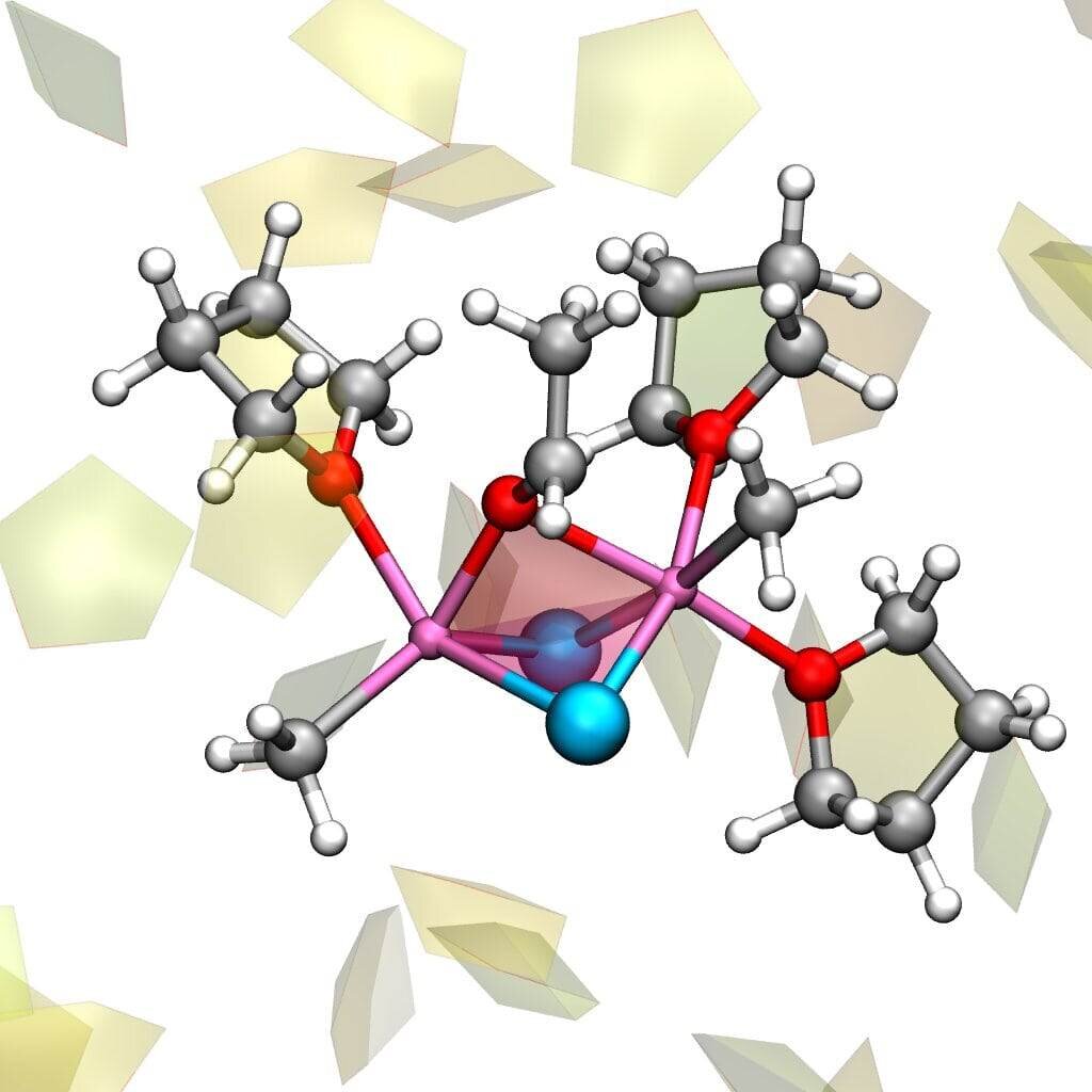 Phức hợp phản ứng của phản ứng Grignard, bao gồm hai phân tử của chất phản ứng Grignard CH3MgCl tương tác với acetaldehyde, và với ba phân tử tetrahydrofuran aether. Những phân tử có khả năng hòa tan khác như pentagon. Credit: Michele Cascella