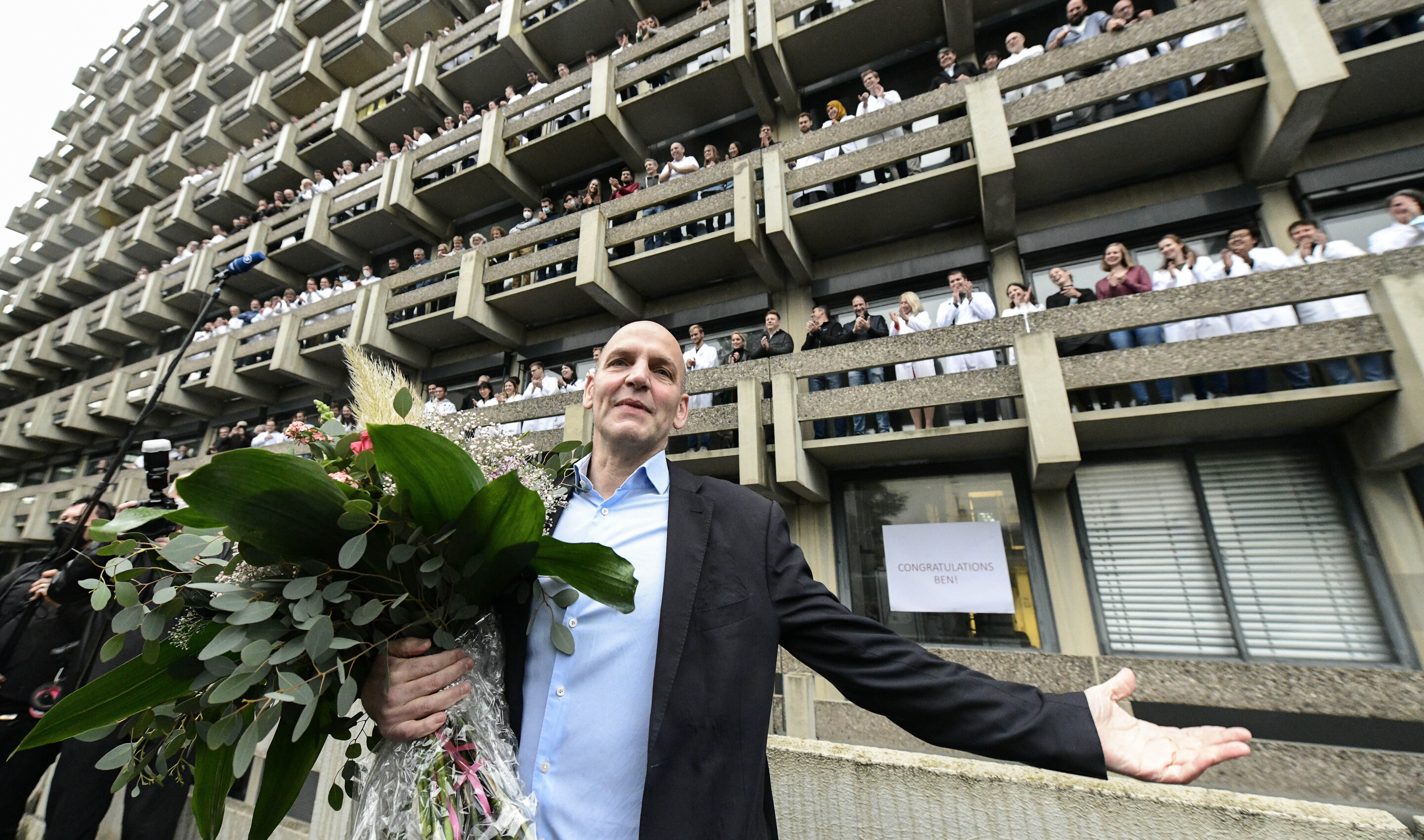 Nhà hóa học Đức Benjamin List chia sẻ niềm vui giành giải Nobel Hóa học 2021 cùng đồng nghiệp ở Viện Nghiên cứu Than đá Max Planck ở Muelheim. Nguồn: AP Photo/Martin Meissner.