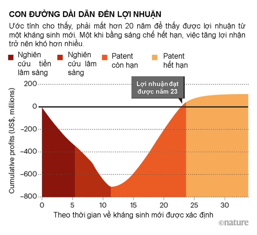 Theo Tổ chức Y tế Thế giới, chỉ có khoảng 14% kháng sinh và sinh phẩm trong các thử nghiệm giai đoạn I có khả năng được chấp thuận. Năm 2016, một nhóm các nhà kinh tế đã ước tính rằng chi phí nghiên cứu cho đến khi được FDA chấp thuận ở Hoa Kỳ là 1,4 tỷ USD, sau đó là hàng triệu đô la Mỹ nữa cho tiếp thị và giám sát sau khi được phê duyệt. Khi các công ty như Eli Lilly hay Merck sản xuất thuốc kháng sinh vào giữa thế kỷ XX, những chi phí đó có thể được dàn trải ra nhiều bộ phận khác nhau của họ. Và thông thường trước đây các công ty lớn mua những công ty nhỏ hơn, khi nhận thấy thuốc mới của các công ty nhỏ có hứa hẹn tiền lâm sàng, giá mua đã bao gồm mọi khoản nợ mà các công ty nhỏ phải gánh chịu.
