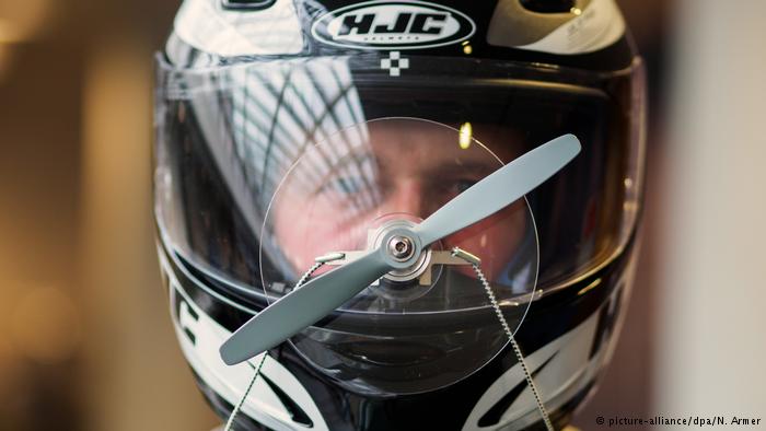 Một giải pháp khác cho bạn khi bị mắc mưa trong lúc rong ruổi trên đường: một chiếc cánh quạt được gắn vào kính của mũ bảo hiểm và nối liền với cốc hút. Nó sẽ giúp tạo ra một luồng khí giữ cho nước mưa không tạt vào mắt bạn.