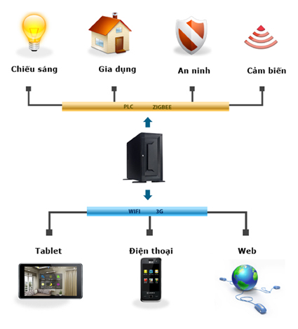 Một hệ thống nhà thông minh cơ bản bao gồm: Máy tính điều khiển trung tâm để kết nối các thiết bị với nhau và điều khiển toàn bộ hệ thống nhà; thiết bị Client, có thể là điện thoại di động, máy tính bảng (Tablet)… để điều khiển và tương tác với ngôi nhà; các thiết bị gia dụng đầu cuối là những vật dụng điện tử trong gia đình như: điều hòa, rèm, mành, hệ thống đèn, quạt thông gió, ti vi, lò vi sóng, bếp ga…
