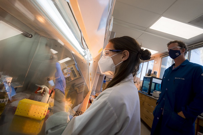Nghiên cứu sinh Viện Hải dương học Scripps Kate Bauman đang nuôi cấy Salinispora mới để cho những nghiên cứu tiếp theo trong một cabin an toàn sinh học với giám đốc phòng thí nghiệm Bradley Moore. Những con vi khuẩn được nuôi cấy này tạo ra salinosporamide A, một chất chống ung thư tiềm năng hiện được đưa vào thử nghiệm lâm sàng pha 3 với bệnh glioblastoma. Nguồn: Erik Jepsen/UC San Diego.