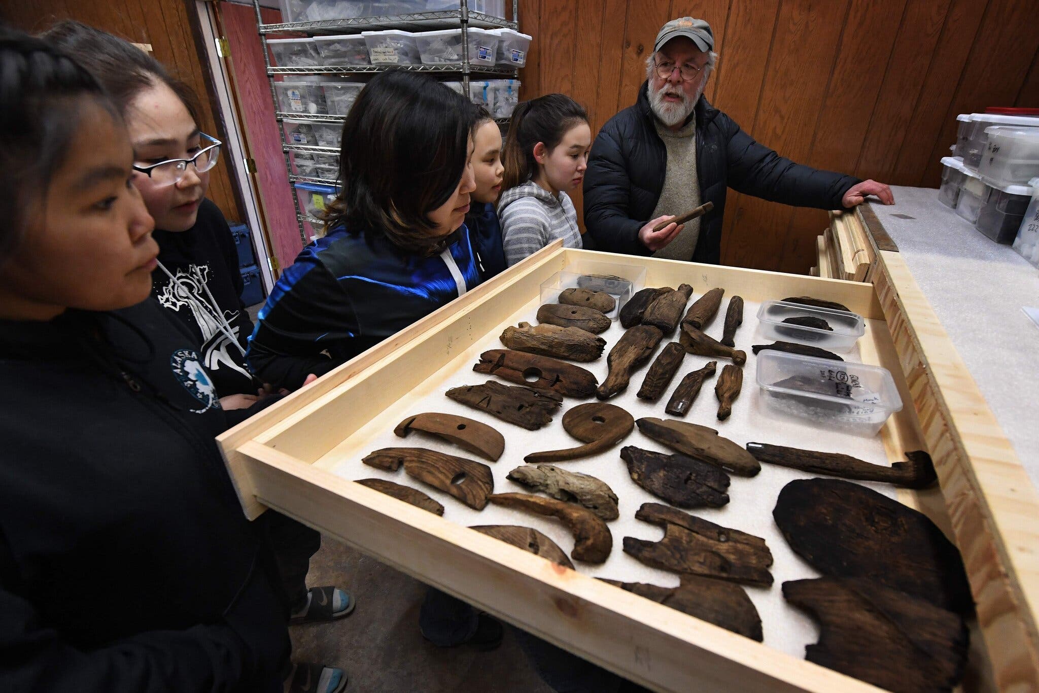 Rick Knecht (phải) giới thiệu với trẻ em địa phương về các đồ tạo tác của Yup’ik được khai quật tại Nunalleq vào năm 2019. Ảnh: Mark Ralston / Agence France-Presse – Getty Images