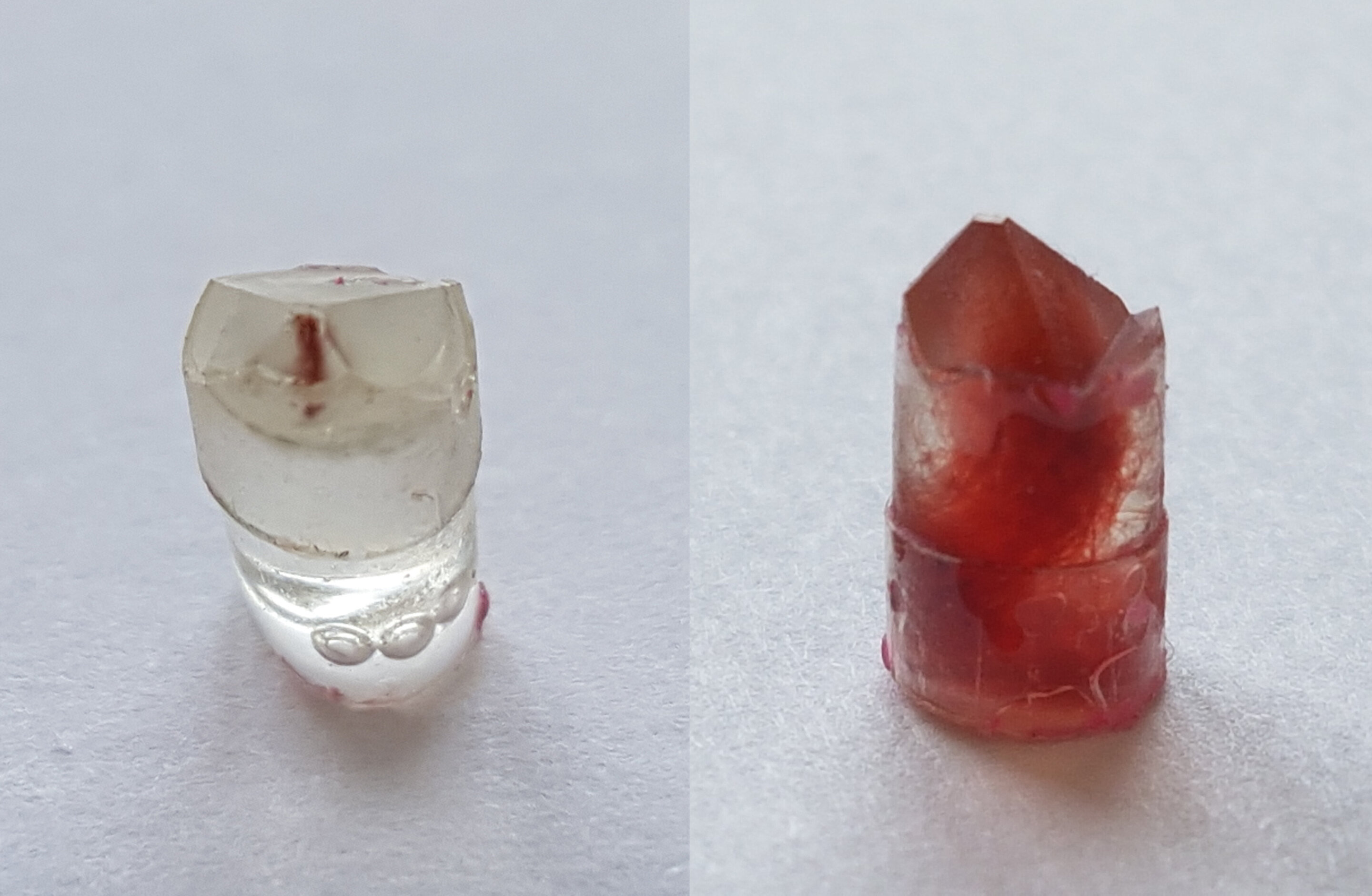 Các sợi lấy từ tấm thảm Pazyryk được nhúng vào nhựa epoxy (trái) còn bên cạnh là mẫu chuẩn mà các nhà nghiên cứu đã cho lên men và tự nhuộm để so sánh. Nguồn: FAU / Dr. Andreas Späth