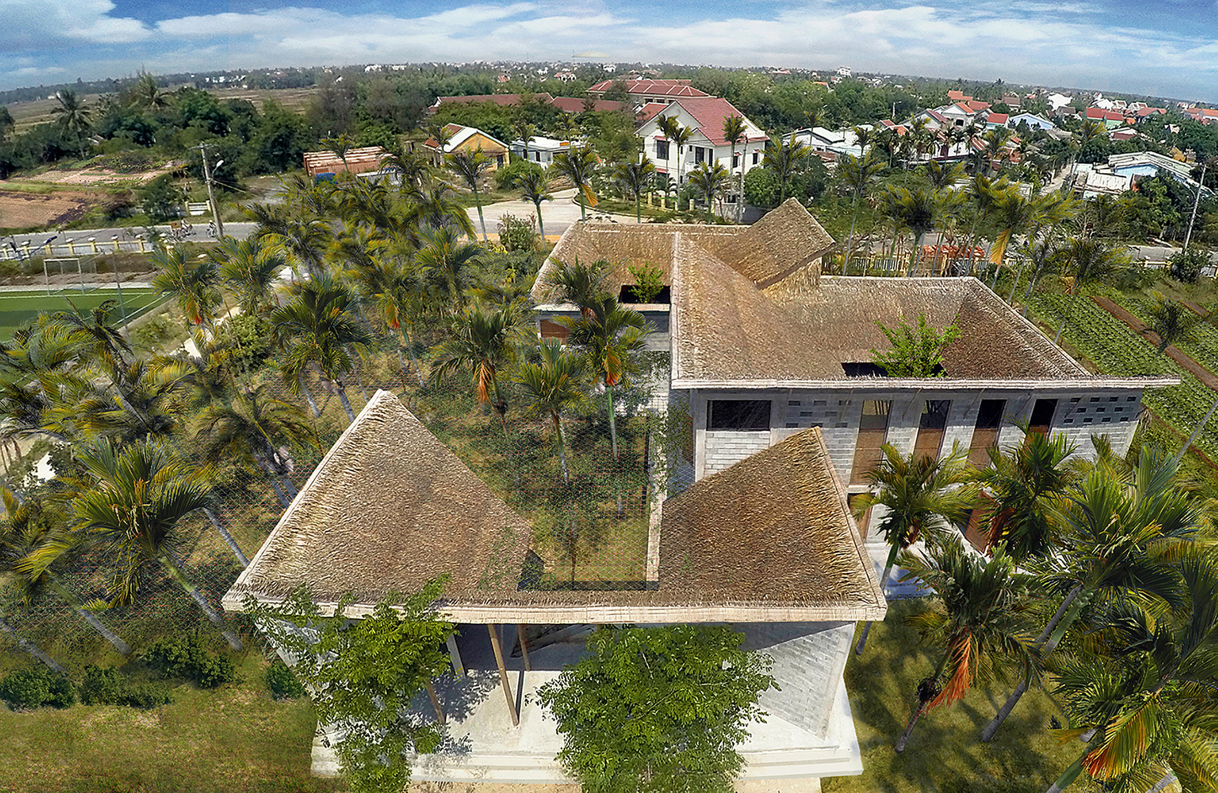 Nhà cộng đồng xã Cẩm Thanh (Hội An) được KTS Hoàng Thúc Hào áp dụng những giải pháp làm mát ít tốn kém như thiết kế mái nhà có chức năng thu nước mưa và dẫn nước vào bể lộ thiên đúng hướng gió vào nhà – gió thổi qua mặt nước sẽ mang theo hơi mát. Nhà làm chủ yếu bằng vật liệu hữu cơ, có độ dẫn nhiệt thấp. Một dàn cây rộng 700m2 bao trùm toàn bộ mái nhà, giảm bức xạ nắng nóng miền Trung. Cây dầu chính là trụ đỡ giàn cây, còn cây leo là loại cho thu hoạch. Ảnh do nhân vật cung cấp.