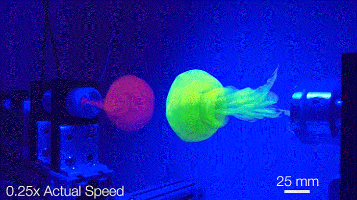 Họ sử dụng những loạt “bắn phá” bằng xoáy chất lỏng trong một bể cá có sức chứa 75gallon để tạo ra các xoáy, mỗi xoáy được nhuộm một màu khác biệt. Nhờ vậy, các nhà nghiên cứu có thể quan sát xem chúng tương tác với nhau khi chúng va chạm vào nhau một cách dữ dội. Dù các vòng tròn biến mất vào một luồng màu sau va chạm chỉ khoảng một giây nhưng khoảng thời gian đó đã là quá nhiều cho các hiện tượng vật lý xảy ra.