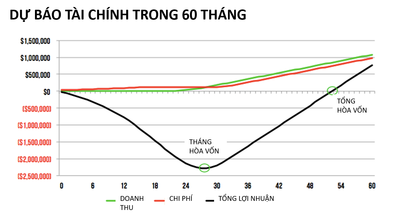 Khi thuyết phục nhà đầu tư. Bạn cần phải làm rõ giả định về giá thành và chi phí. Bạn nên có kế hoạch doanh thu theo tháng ít nhất là trong 36 (hoặc 60) tháng đầu tiên. Và, dĩ nhiên, doanh thu trừ đi chi phí chí cho ra lãi suất ròng. Tiếp đó, bạn sẽ cần chứng minh sau bao nhiêu tháng thì bạn hòa vốn. Hòa vốn được định nghĩa là điểm tại đó bạn kiếm được nhiều hơn những gì bạn chi ra (nói cách khác, thu nhập của bạn là dương).
