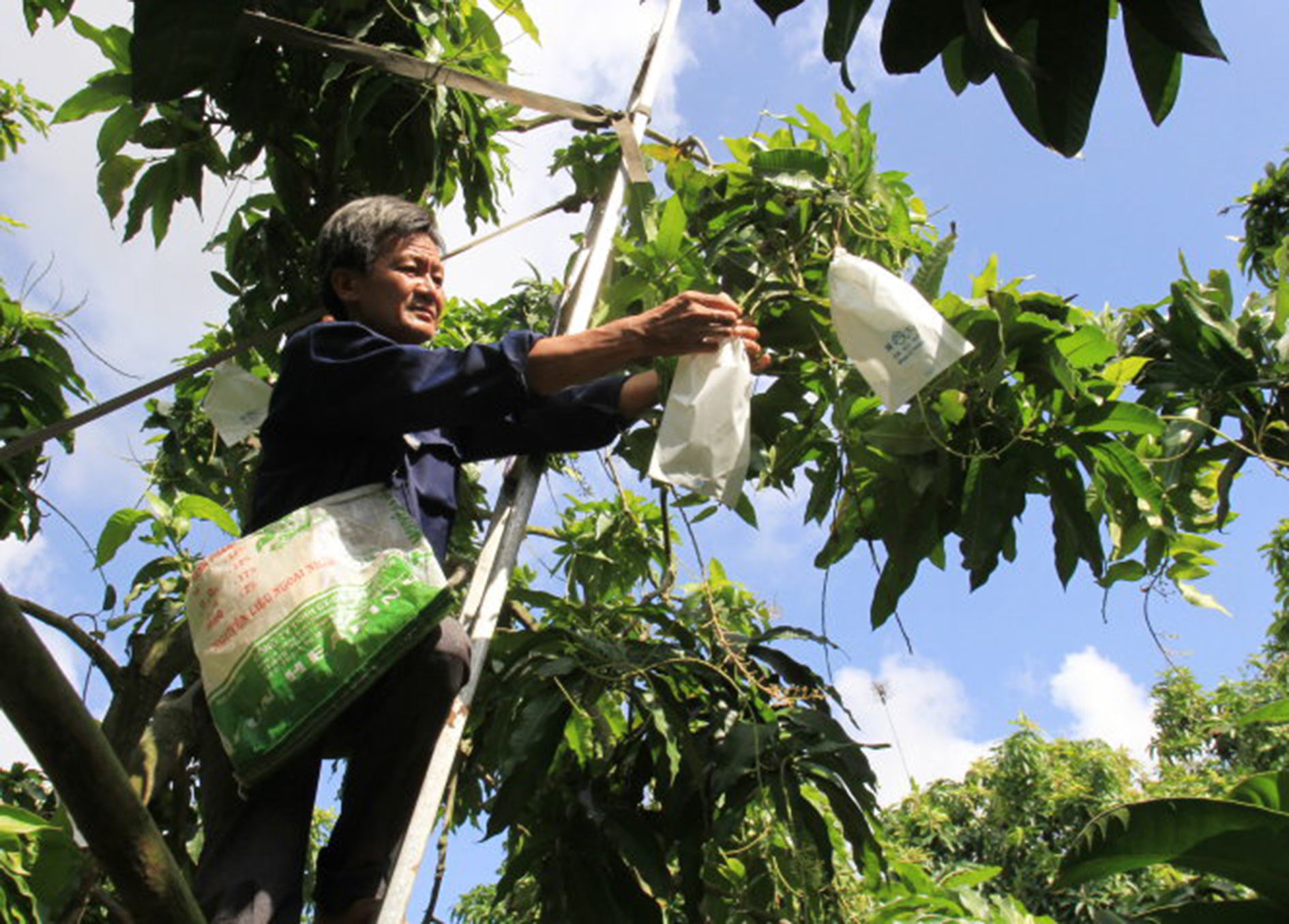 Bao trái xoài là một kỹ thuật để bảo vệ trái xoài từ khi được 40 ngày tuổi cho đến lúc thu hoạch, đảm bảo trái xoài không có thuốc và chín đều, vỏ đẹp, không có vết. Đây cũng là một điều kiện cần để nhà vườn đạt Global Gap. 80% nhà vườn ở Đồng Tháp sử dụng kỹ thuật này. Ảnh: dungcunongnghiep.com.