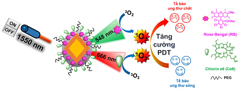 Sơ đồ minh họa cơ chế liệu pháp PDT dựa trên vật liệu nano phát quang ngược (UCNPs) mang chất nhạy quang kép. Hạt nano UCNPs (kích thước khoảng 43 nm) được bọc bởi vỏ silica (màu xám), sau đó hai chất nhạy quang là RB và Ce6 được tải lên vỏ silica này. Dưới kích thích của laze bước sóng 1550 nm, hạt nano UCNPs sẽ chuyển ánh sáng kích thích thành hai bức xạ mới có bước sóng 548 nm và 666 nm. Hai loại bức xạ sẽ được hấp thụ đồng thời bởi chất nhạy quang RB và Ce6 tương ứng. Việc kích thích hai chất nhạy quang cùng lúc tạo ra lượng singlet oxygen (1O2) dồi dào, tiêu diệt nhiều tế bào ung thư hơn, từ đó tăng hiệu quả liệu pháp PDT.