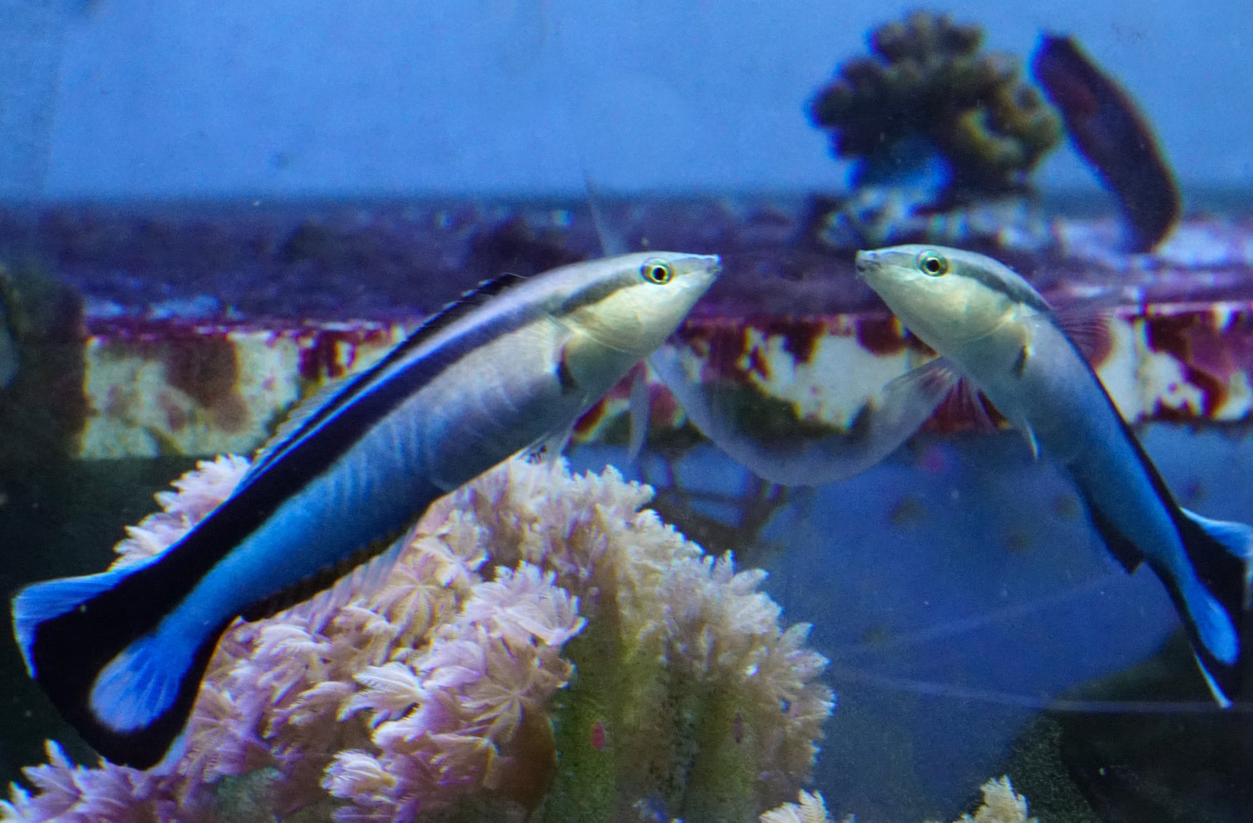 Một con cá dọn vệ sinh sọc lam tương tác với hình ảnh phản chiếu của nó trong gương đặt ngoài bể kính. Nguồn: Alex Jordan/Max Plant Institute/PLOS Biology