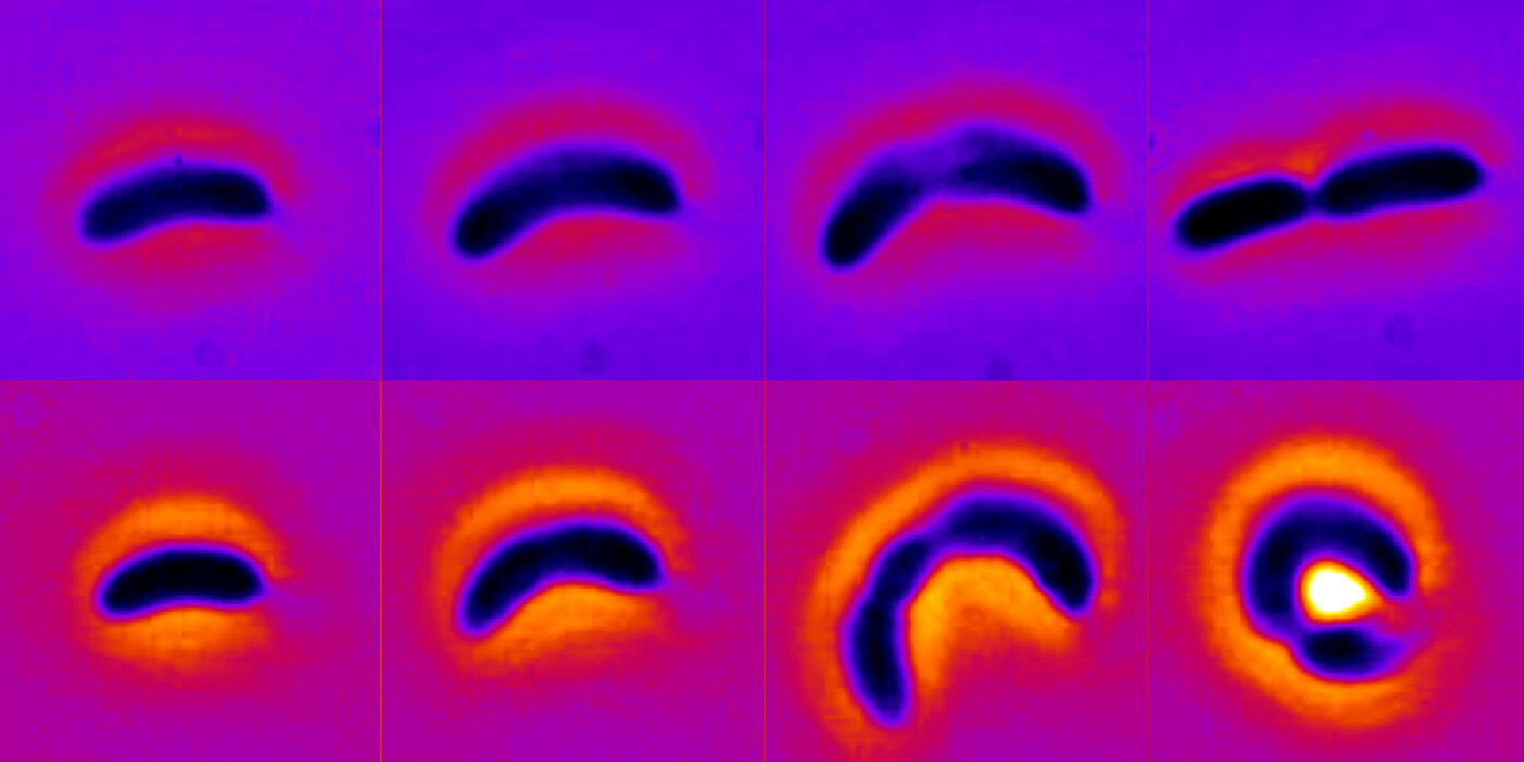 So sánh sự tăng trưởng của vi khuẩn Caulobacter crescentus khi bị phơi nhiễm một loại kháng sinh (dưới) và không bị phơi nhiễm kháng sinh (trên). Nguòn: Carnegie Mellon University