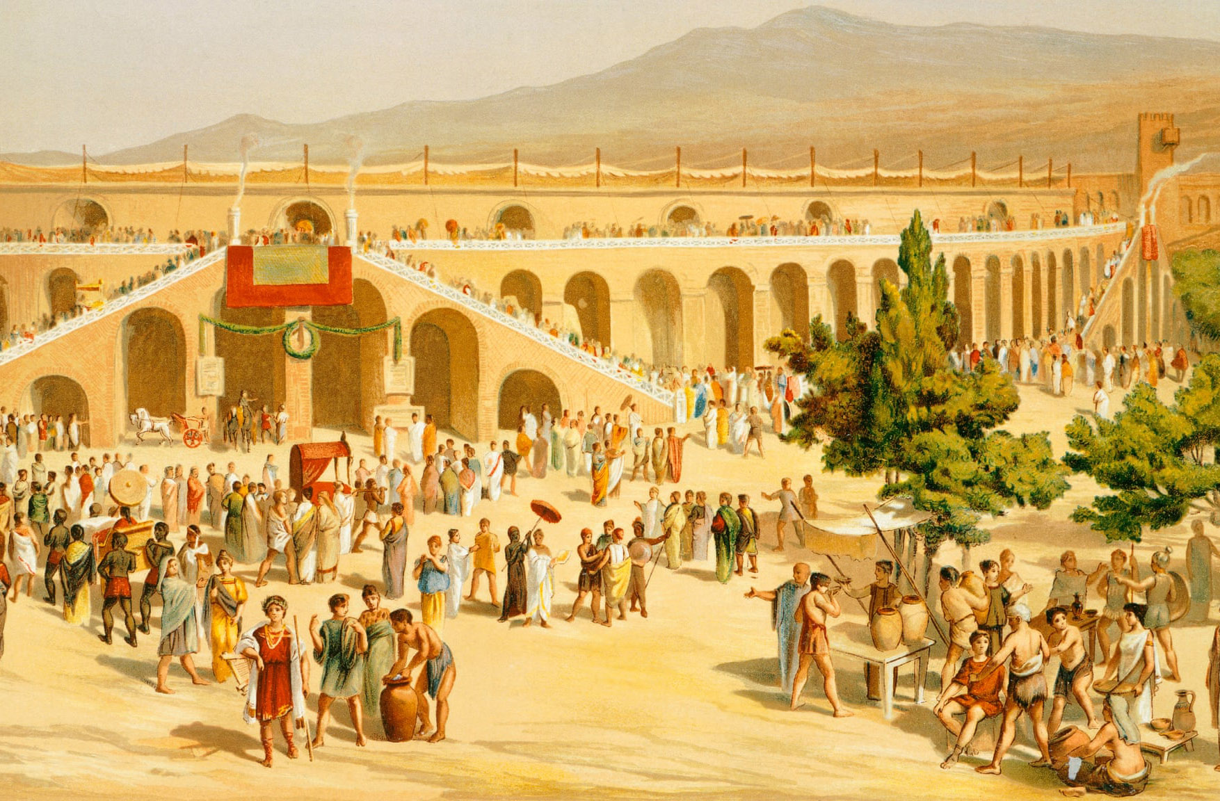 Tái hiện một phiên chợ ở quảng trường, từ cuốn “The Houses and Monuments of Pompeii” (Fausto và Felice Niccolini). Nguồn: DEA/G Dagli Orti/De Agostini via Gett