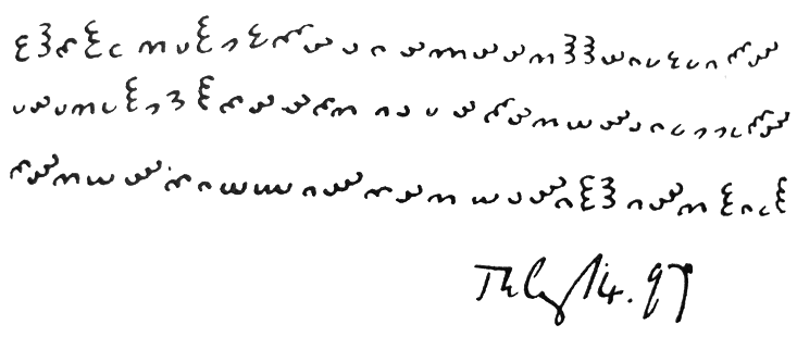 Những dòng chữ viết nguệch ngoạc của Elgar thực ra là một mật mã. Nó bao gồm 87 kí tự, trải đều trên ba dòng. Nó chứa 24 biểu tượng khác nhau, mỗi biểu tượng có một, hai, ba nét móc hoặc đường cong. Các kí tự có thể có tám góc nghiêng khác nhau. Dora thoạt nhìn không hiểu chúng có ý nghĩa gì, cô cất vào ngăn tủ và không hề nhìn tới nó trong 40 năm sau.