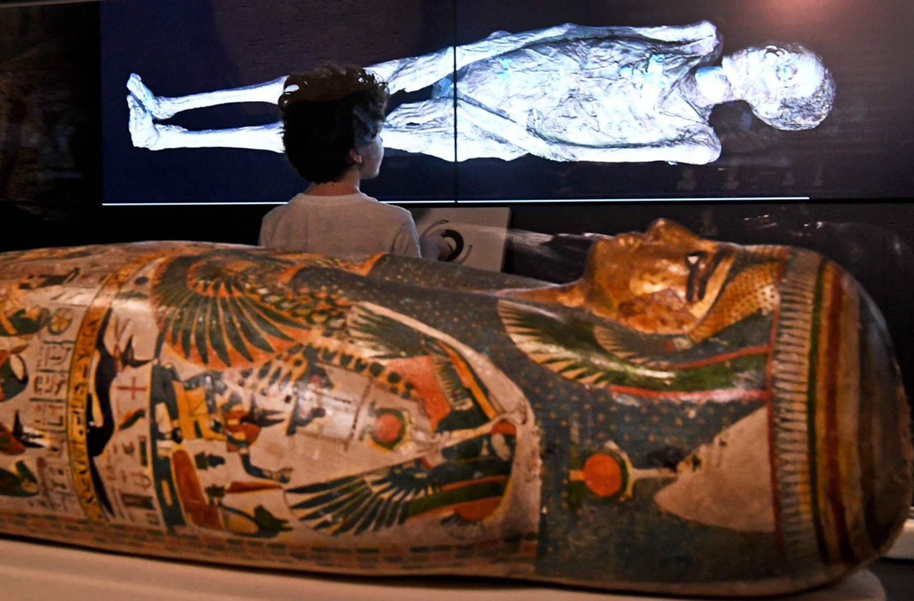 Một em nhỏ xem bản chụp cắt lớp của xác ướp Ai Cập trong một triển lãm tại bảo tàng Powerhouse, Sydney, Úc (trước đó, một triển lãm tương tự đã được tổ chức tại Bảo tàng Lịch sử Tự nhiên, Los Angeles, Mỹ vào tháng 9 năm ngoái). Nguồn ảnh: CGTN.