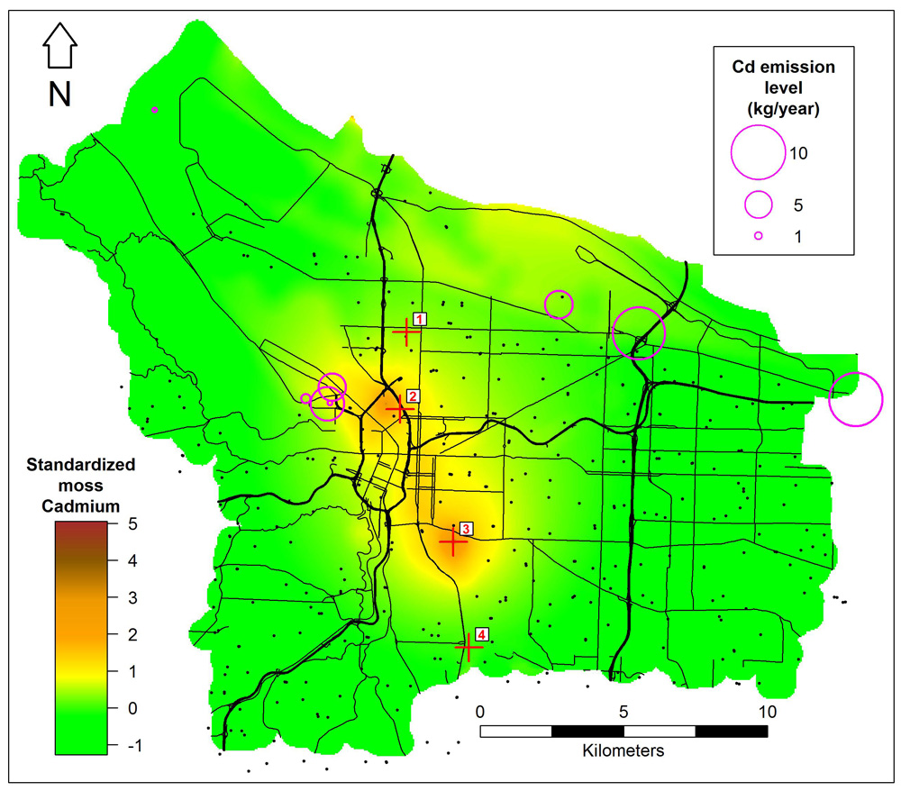 Jovan cùng đồng nghiệp ở Cục Kiểm lâm Mỹ và các nhà nghiên cứu ở trường Đại học Drexel đã sử dụng một mô hình đưa 346 mẫu rêu Orthotrichum lyellii được thu thập năm 2013 từ các cây rụng lá ở những điểm cách nhau một phần tư ki lô mét trong thành phố vào một bản đồ chi tiết về các điểm nóng ô nhiễm để giúp DEQ có thể dễ dàng hình dung ra kết quả điều tra của họ. Phân tích cho thấy, hàm lượng Cadmium trong rêu liên quan với hai nhà máy sản xuất kính màu Bullseye và Uroboros ở gần biên giới giữa hai bang Oregon–Washington, đặc biệt cao ở gần nhà máy. Trung bình hằng tháng, nồng độ cadmium trong không khí là 29,4 ng/m3, cao hơn 49 lần so với mức chuẩn 0,6 ng/m3 của bang Oregon và đủ cao để gây rủi ro cho sức khỏe ngay cả khi tiếp xúc trong thời gian ngắn. Tuy nhiên, cả hai nhà máy này đều “lọt lưới” giám sát phát thải của các nhà quản lý môi trường.