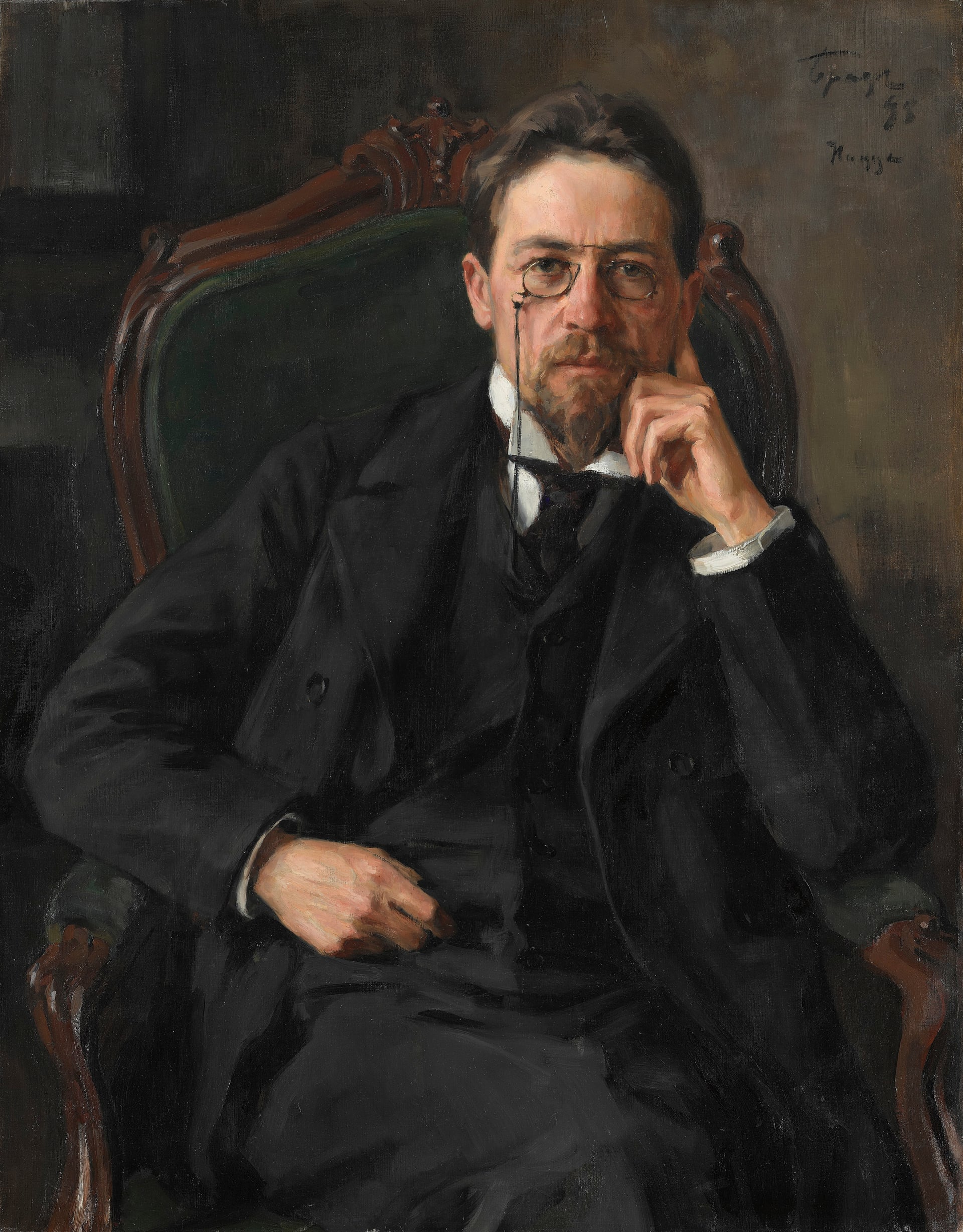 Chekhov ngồi trên ghế tựa màu xanh, cổ áo trắng tinh và kính gọng mũi, ngón tay khép lại. Trong bức chân dung tinh tế và trang nghiêm này của Iosif Braz, phong cách của Chekhov không hoàn toàn giống một nhà văn mà gợi đến một bác sỹ y khoa – nghề nghiệp ông được đào tạo, đang lắng nghe một cách cẩn trọng lời nói của bệnh nhân và suy ngẫm các dữ liệu để chẩn đoán bệnh. Ở tuổi 38, Chekhov chỉ còn 6 năm nữa để sống. Cũng như Mussorgky, ông qua đời khi còn trẻ.