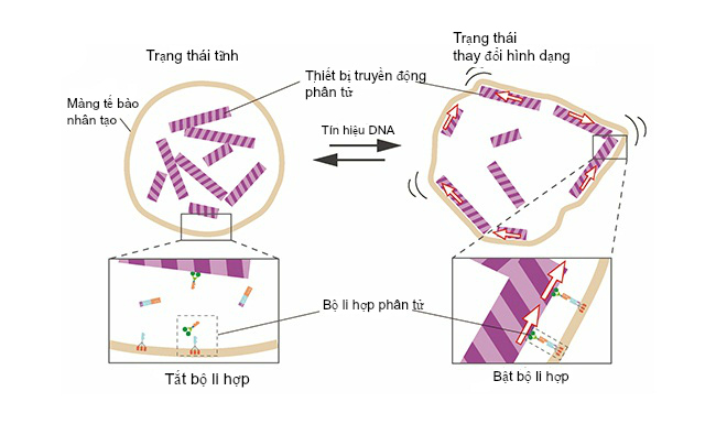 Bộ dẫn động phân tử hoạt động bên trong robot (sọc) để thay đổi hình dạng của màng tế bào nhân tạo. Khi nhận được một tín hiệu DNA, “bộ li hợp phân tử” sẽ truyền lực từ bộ dẫn động, kiểm soát việc thay đổi hình dạng.