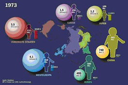 Điều này cũng được thể hiện rất rõ trong nền kinh tế Mỹ: Cho đến những năm 1970 sự phát triển sản xuất ở Mỹ lan ra khắp thế giới, đồng đôla và hàng hóa Mỹ xuất hiện khắp mọi nơi. Châu Âu và nước Nhật bị tàn phá trong chiến tranh được xây dựng lại nhờ vào sức mạnh của nước Mỹ. Trong bốn thập niên nước Mỹ là quốc gia xuất khẩu lớn nhất thế giới đồng thời cũng là quốc gia cung cấp nhiều tín dụng nhất trên thế giới. Quốc gia giàu có nhất thế giới bơm tiền của, hàng hóa tới các nước nghèo hơn. Nước Mỹ sử dụng nguồn năng lượng hừng hực trong sản xuất của họ để làm bùng lên ngọn lửa sản xuất ở các nước khác hoặc chí ít cũng giúp cho ngọn lửa đó ở một số nước khác lóe lên. Không ai có thể phủ nhận nước Mỹ là trung tâm sức mạnh của thế giới. Từ đây các nguồn năng lượng lan tỏa đi khắp nơi.