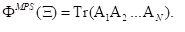 |Ψ〉 =∑ΞΦ(Ξ)||Ξ〉|Ψ〉=∑ΞΦ(Ξ)|Ξ〉 trong đó |Ξ〉=(σ1,σ2,…,σN) biểu thị một cấu hình khả dĩ của N qubit còn Φ(Ξ) là một hàm phức xác định biên độ và pha của trạng thái. Có thể hiểu trạng thái lượng tử là một hộp đen tính toán mà với một |Ξ〉 đã cho sẽ trả về một số phức Φ(Ξ), là hệ số của thành phần |Ξ〉 của trạng thái. Biểu diễn mạng-tenxơ sử dụng các tenxơ để biểu diễn các trạng thái lượng tử. Hạng của tenxơ biểu thị thứ nguyên của nó (hoặc số chỉ số mà nó có), do đó, tenxơ hạng 1 là vectơ, tenxơ hạng 2 là ma trận, v.v. Để đơn giản, xét một hệ 1 chiều với N qubit, như hiển thị trên Hình 1a, được biết đến như biểu diễn trạng thái tích ma trận (Matrix Product State – MPS). Mỗi qubit ứng với một tenxơ Aijk, là tenxơ hạng 3. Các tenxơ tạo thành một mạng trong đó các kết nối biểu diễn các chỉ số của các tenxơ. Nếu hai tenxơ được kết nối, thì chỉ số chung của chúng bị rút lại bằng cách tính tổng tất cả các giá trị có thể có của chỉ số lặp. Trong trường hợp hệ 1 chiều, hai trong số các chỉ số của mỗi tenxơ được kết nối với các tenxơ lân cận và bị rút lại thành tenxơ hạng 1, biểu diễn bậc tự do vật lý. Trạng thái lượng tử do đó sẽ có dạng
