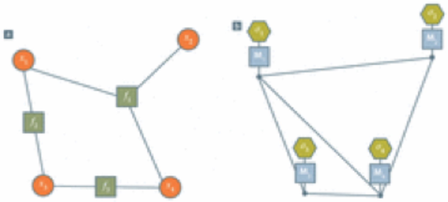 Hình 4. Các mô hình thế hệ cổ điển và lượng tử được sử dụng rộng rãi trong cả máy học có giám sát và không giám sát. (a) Mô hình thế hệ cổ điển mô tả phân bố xác suất chung của các vật quan sát xi là tích của các hàm nhân tố: P(x1, x2, x3, x4) = f1(x1, x2, x4) f2(x1, x3) f3(x3, x4). Việc học sau đó được quy về việc tối ưu hóa các tham số có thể điều chỉnh trong các hàm fi. (b) Mô hình thế hệ lượng tử với bốn qubit σi. Hình vẽ biểu thị trạng thái lượng tử đặc biệt được xây dựng bằng cách tác động các ma trận khả nghịch hai hàng hai cột Mi lên trạng thái của mạng tenxơ. Phân bố xác suất có thể nhận được từ các phép đo chiếu lên trạng thái kết quả. Việc học quy về việc tối ưu hóa các tham số có thể điều chỉnh trong các ma trận Mi.