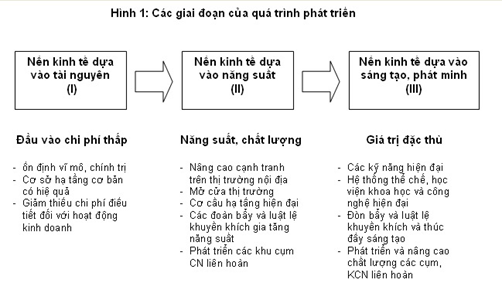 Trong quá trình phát triển, theo Porter, các quốc gia sẽ trải qua 3 giai đoạn đó là: (I) Nền kinh tế dựa vào tài nguyên; (II) Nền kinh tế dựa trên năng suất và (III) Nền kinh tế phát triển nhờ sáng tạo, phát minh. Việt Nam đang đi theo mô hình tăng trưởng thấp nhất (I) vẫn chủ yếu dựa vào khai thác tài nguyên, công nghệ gia công, và gia tăng vốn đầu tư vào các ngành thâm dụng vốn được nhà nước bảo hộ (xi măng, thép, ô tô…). Những hạn chế này khiến chất lượng tăng trưởng và hiệu quả của nền kinh tế của nền kinh tế thấp. Vì vậy, chúng ta cần chuyển đổi mô hình tăng trưởng theo hướng tăng hiệu quả sử dụng nguồn lực, phát triển xanh, thân thiện với môi trường, tức là chuyển sang giai đoạn 2 của quá trình phát triển (xem Hình 1), trong đó đòi hỏi nâng cao chất lượng tăng trưởng và năng lực cạnh tranh của nền kinh tế.