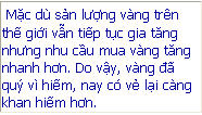 Hãy nói về cung. Trong năm 2004 các mỏ vàng trong thế giới sản xuất ra 2.461 tấn, trong năm 2005 dự trù sẽ tăng lên tới 2.495 tấn, tức là số sản xuất tăng được trên 30 tấn vàng. Nhưng nhu cầu mua vàng tăng nhanh hơn. Vàng đã quý vì hiếm, nay có vẻ lại khan hiếm hơn. Năm 2004, thế giới tiêu thụ 3.840 tấn vàng, năm 2005 ước lượng sẽ lên tới 3.957 tấn, tức là tiêu thụ thêm gần 120 tấn hơn trước. Số vàng được sản xuất tăng lên nhưng khó đuổi kịp vàng được số tiêu thụ đơn giản vì việc khai mỏ đương nhiên chậm chạp hơn việc người ta bảo nhau đi mua vàng.