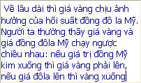 Về lâu dài thì giá vàng chịu ảnh hưởng của hối suất đồng đô la Mỹ. Người ta thường thấy giá vàng và giá đồng đôla Mỹ chạy ngược chiều nhau: nếu giá trị đồng đô la xuống thì giá vàng phải lên, nếu đô la lên thì vàng xuống. Nhưng trong mấy tháng qua ta thấy điều bất thường: Giá vàng trên thế giới lên mà giá đồng đôla Mỹ cũng tăng lên, so với đồng Yên Nhật Bản và đồng Euro của Âu Châu. Vì giá đô la còn chịu ảnh hưởng của nhiều yếu tố khác. Nhiều chính phủ dư ngoại tệ như Trung Quốc hay Nhật Bản vẫn chọn đem tiền cho nước Mỹ vay, để họ mua hàng. Nhiều nhà đầu tư quốc tế cũng thấy nền kinh tế Mỹ có cơ hội sinh lợi cao cho nên tiếp tục cho các công ty Mỹ vay tiền hoặc mua cổ phần Mỹ. Nhờ những dòng tiền đổ vào nước Mỹ cho nên đồng đô la vẫn lên giá mặc dù vàng cũng lên giá! Nhưng sẽ tới lúc tình trạng thiếu quân bình này phải chấm dứt, giá đồng đô la sẽ xuống trong khi giá vàng lên./.