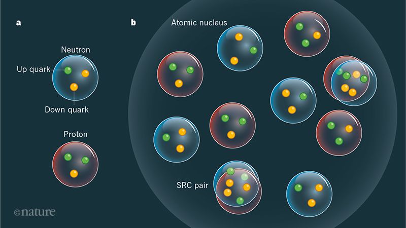 Các proton và neutron biến đổi trong hạt nhân. a, Nucleons — neutrons and protons — gồm các hạt cơ bản mà ta gọi là quark. Neutrons chứa một quark lên và hai quark xuống, trong khi các proton chứa hai quark lên và một quark xuống. b, Trong một hạt nhân nguyên tử, các nucleon có thể tương tác trong những gì mà chúng ta vẫn gọi là cặp tương quan phạm vi ngắn (SRC).