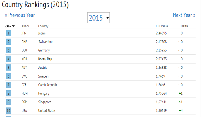 10 quốc gia xếp hạng cao nhất về chỉ số phức tạp của nền kinh tế. Quan niệm cho rằng Singapore là một nước chỉ làm dịch vụ là không đúng. Nguồn: The atlas of economic complexity