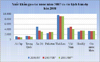 Năm 2008, Thái Lan, Việt Nam, Ấn Độ, Pakistan, Trung Quốc, Ai Cập, Hoa Kỳ vẫn là 7 nước được dự báo vẫn đứng đầu thế giới về xuất khẩu gạo, với tổng khối lượng gạo xuất khẩu dự kiến đạt 23,7 triệu tấn, chiếm 82% thị phần của thế giới. Trong đó Thái Lan dự kiến tăng lượng gạo xuất khẩu lên từ 500.000 tấn-1 triệu tấn và đạt mức 9,5 triệu tấn, Hoa Kỳ và Pakistan ổn định ở mức 3,5 và 2,9 triệu tấn tương ứng. 4 nước gồm Trung Quốc, Việt Nam, Ai Cập, Ấn Độ sẽ cắt giảm lượng gạo xuất khẩu trong năm nay: So với năm 2007, xuất khẩu gạo của Việt Nam dự kiến giảm từ 500.000 tấn- 1 triệu tấn, Ai Cập giảm 400.000 tấn, Ấn Độ giảm 500.000 tấn, Trung Quốc giảm 340.000 tấn, kèm theo đó là một loạt các chính sách hạn chế xuất khẩu gạo được áp dụng như áp dụng giá xuất khẩu tối thiểu, áp dụng thuế xuất khẩu gạo, hạn ngạch. Đây là một trong những nguyên nhân chính dẫn đến khả năng làm giảm thương mại lúa gạo của thế giới trong năm nay.