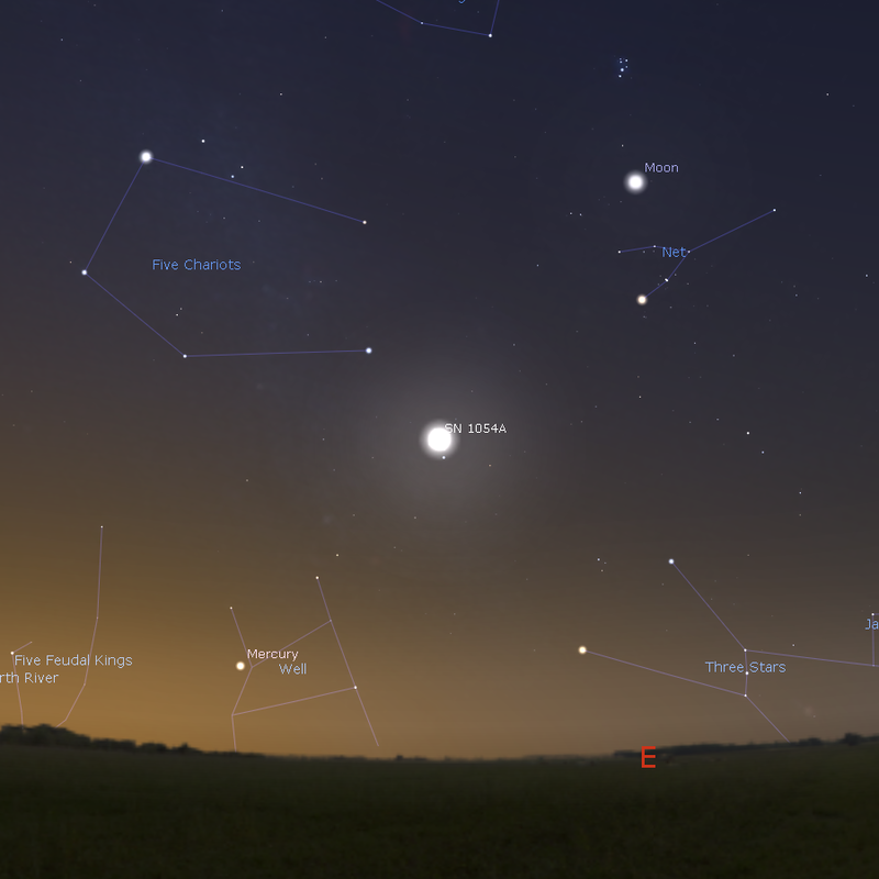 Mô phỏng SN 1054 trên bầu trời kinh đô Khai Phong của nhà Bắc Tống (960-1127). Theo Tống hội yếu tập cảo, khi mới xuất hiện, ngôi sao khách sáng “như sao Kim giữa ban ngày”. Nguồn: JWNoctis/Wikimedia Commons; Stellarium