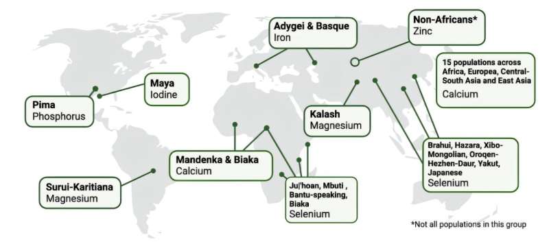 Với mỗi loại khoáng chất, nhóm nghiên cứu đã tìm thấy bằng chứng về sự thích nghi trong gene (những thay đổi di truyền để thích ứng với môi trường) của ít nhất một quần thể dân cư, và các vi chất dinh dưỡng thể hiện rõ tác động trên toàn cầu. Điều này cho thấy mỗi loại vi chất dinh dưỡng có thể đã ảnh hưởng đến quá trình tiến hóa của loài người tại một thời điểm nào đó trong lịch sử và ở một số quần thể.