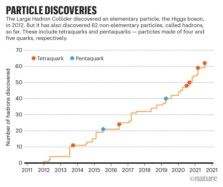 Các tetraquark cực hiếm: phần lớn các hadron đã biết đều chỉ làm từ hai hoặc ba quark. Tetraquark đầu tiên do Tổ chức nghiên cứu Máy gia tốc năng lượng cao (KEK) ở Tsukuba, Nhật Bản tìm thấy vào năm 2003, và LHCb tìm thấy phần lớn trong chỗ còn lại. Nhưng hạt mới quả thực là một kỳ dị. Các tetraquark trước dường như là các cặp hệ đôi quark thu hút lẫn nhau như những nguyên tử trong một phân tử nhưng nhà vật lý lý thuyết Marek Karliner cho rằng kẻ mới nhất có thể là một bộ tứ được gắn kết một cách chặt chẽ. “Đây là một cú lớn. Một loại mới chứ không phải là dạng phân tử hadron. Đây là đại diện đầu tiên của loại này”, theo đánh giá của Karliner, người làm việc tại trường đại học Tel Aviv ở Israel và giúp dự đoán sự tồn tai của một hạt với các đặc tính tương tự như Tcc+ vào năm 2017.